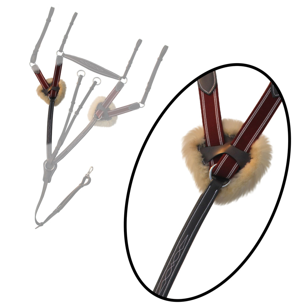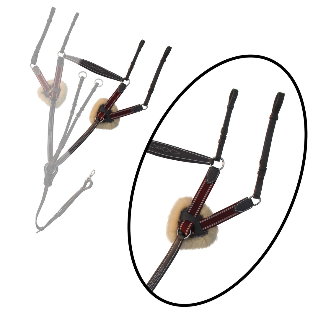 The 5-point design will naturally distribute the pressure over a larger area than a breastplate with just a couple of points of contact. It could also be said that 5-point breastplates don’t put as much pressure on the tree of the saddle when the rider jumps. Use of original Sheep skin and burgundy Elastic and white Lines leather amalgamated inserts at Shoulder.