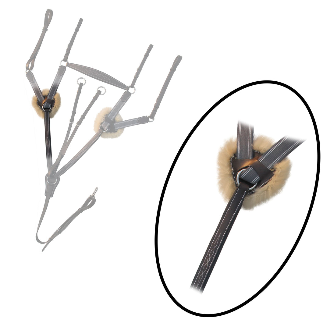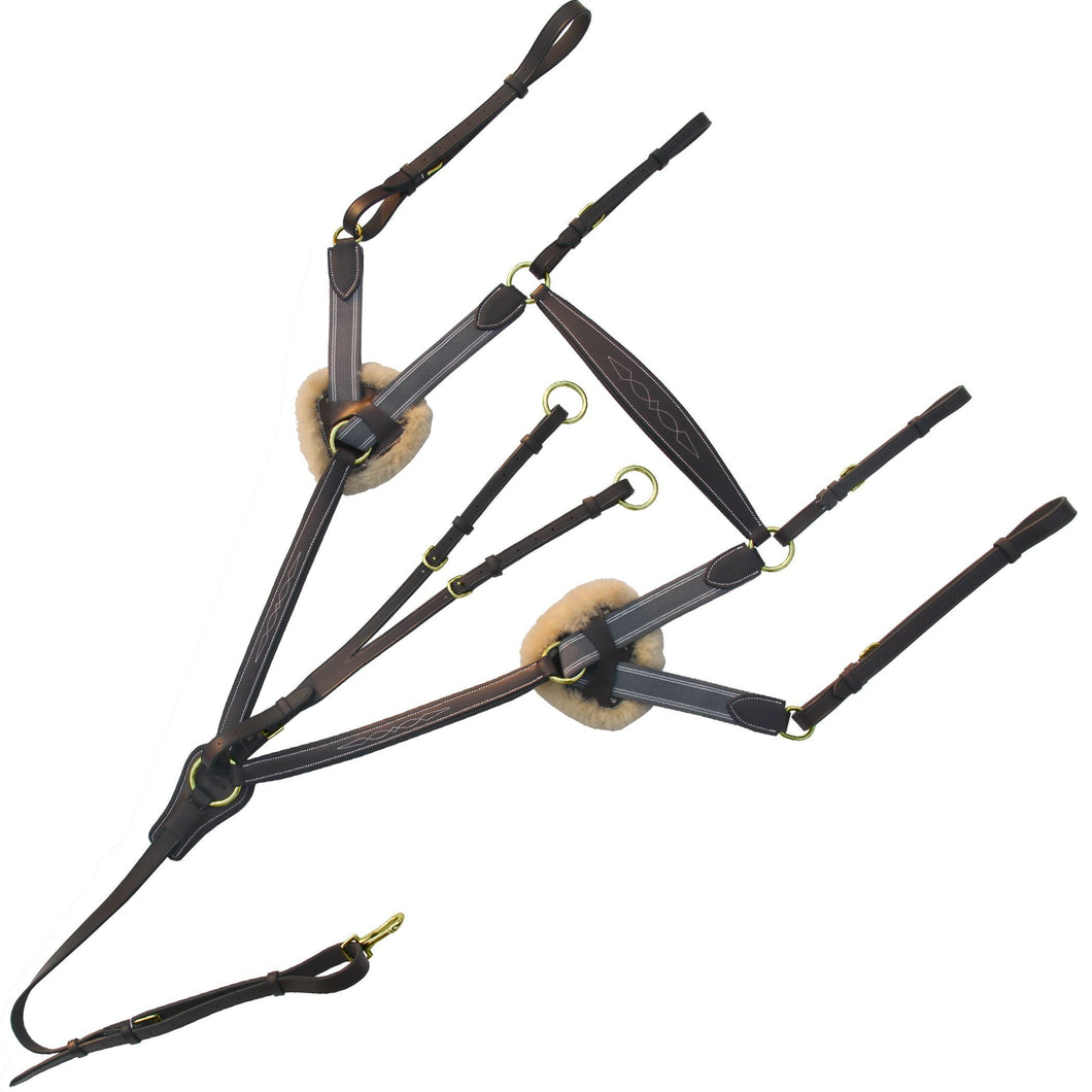 The 5-point design will naturally distribute the pressure over a larger area than a breastplate with just a couple of points of contact. It could also be said that 5-point breastplates don’t put as much pressure on the tree of the saddle when the rider jumps. Use of original Sheep skin and grey Elastic and white Lines leather amalgamated inserts at Shoulder.