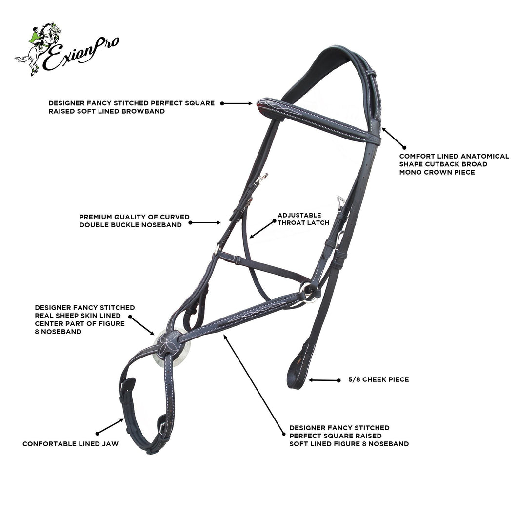 Exion Comfort Cutback Soft Lined Anatomic Shape Mono Crown Piece Designer Fancy Stitched Perfect Square Raised Double Buckle Adjustable Figure 8 Noseband English Jumping Bridle with Rubber Reins