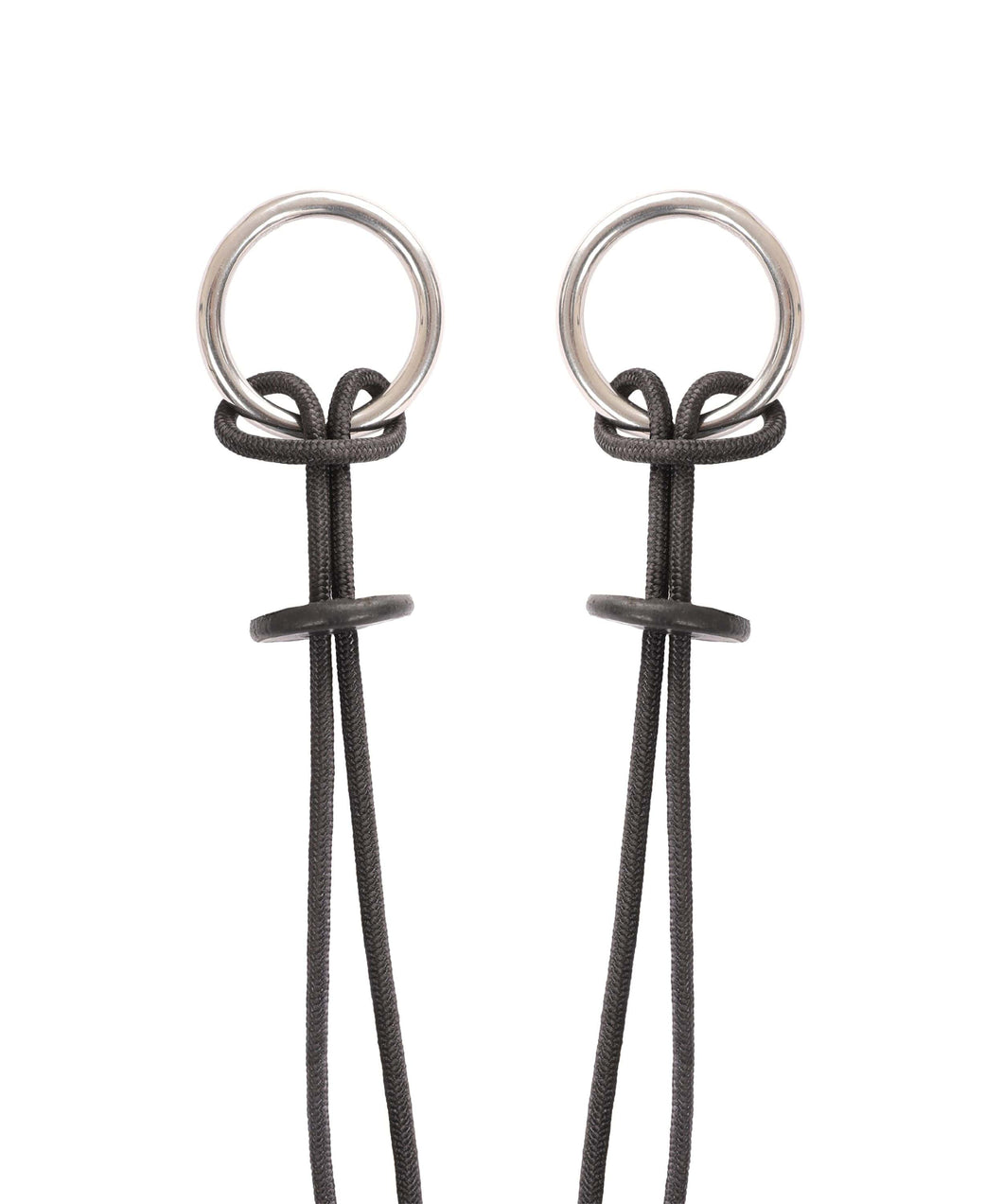 The rings are not stitched onto the nylon ropes but fixed with a rope loop only. Just slide the rope down through the gag bit, then loop the rope over the ring.