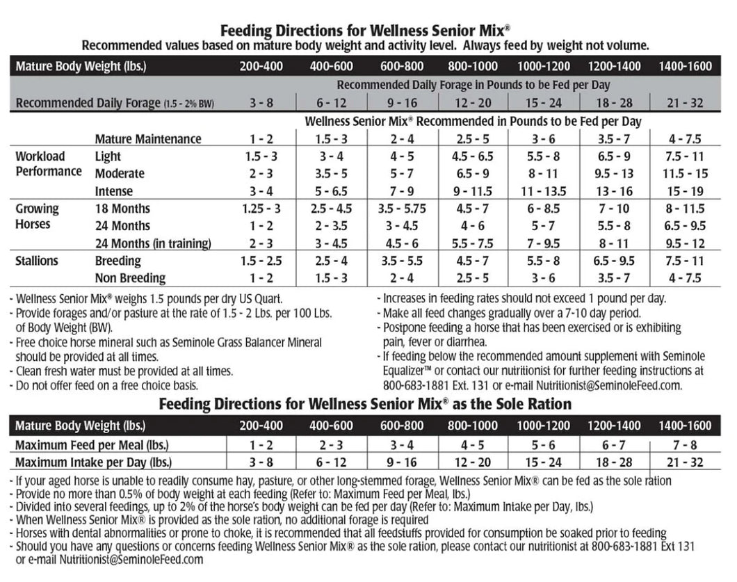 Whether feeding the long-yearling, equine athlete, or elder horse, Wellness Senior Mix® is scientifically formulated to support their daily nutrient demands as a super-premium, low-starch, high-fat, complete feed. The easy-to-chew form, enhanced with nine all-natural herbs, provides an exquisite flavor and increased digestibility. Wellness Senior Mix®, designed for the unique needs of senior horses, provides the satisfaction of receiving superior nutrition day after day. Wellness Senior Mix® is made with the lifetime of your equine partner in mind.