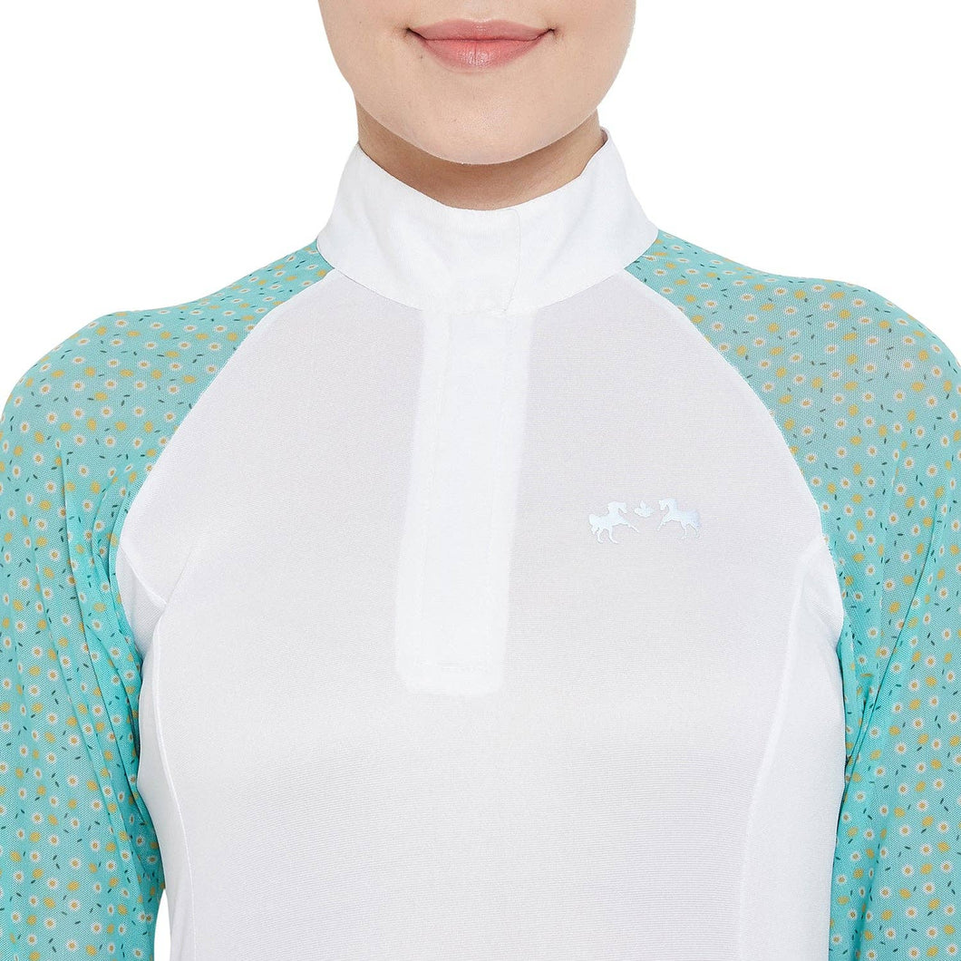 Recreate your equestrian look with a little casual, comfy and stylish touch by escorting yourself with this Smyrna Printed Long Sleeve Show Shirt from Equine Couture. The EquiCool technology of the shirt assists a UV protective layer to your skin enabling you to enjoy horse-riding for long hours. The wrap collars combined with a hidden zipper make the shirt look both traditional and stylish at the same time. The printed mesh sleeves and shoulders of this shirt assemble it to look passionate and effortless along with proper ventilation for your skin. The contrast panel feature of this shirt offers enhanced breathability and makes it suitable for warm days.