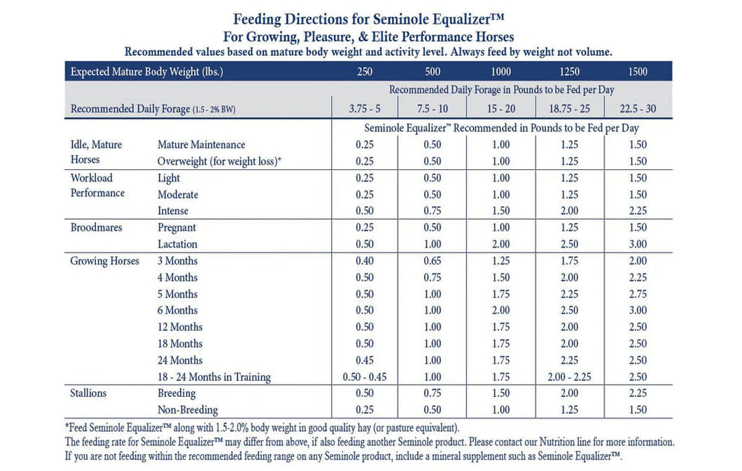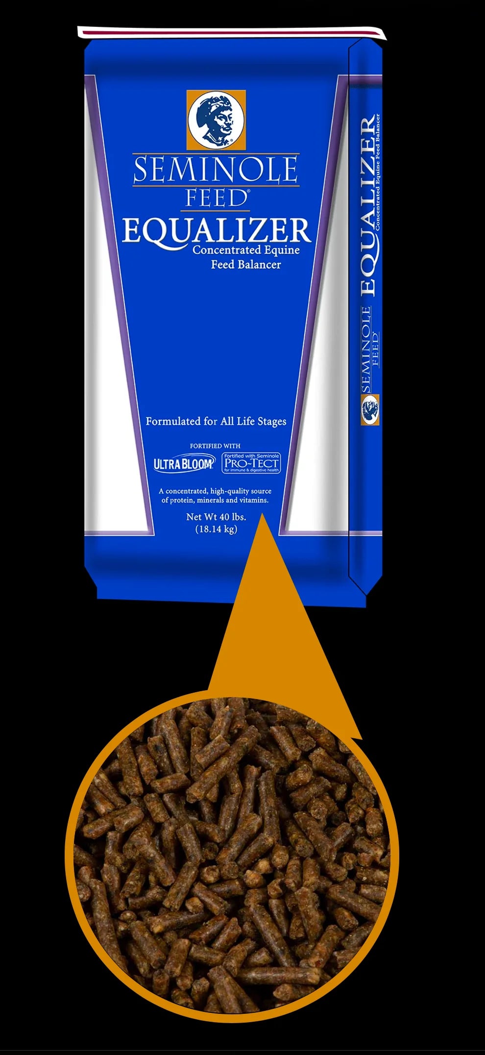 Seminole Equalizer™ as the Sole Ration – Seminole Equalizer will provide necessary amino acids, vitamins, and minerals when fed as the sole feed along with grass pasture and/or hay for adult horses.