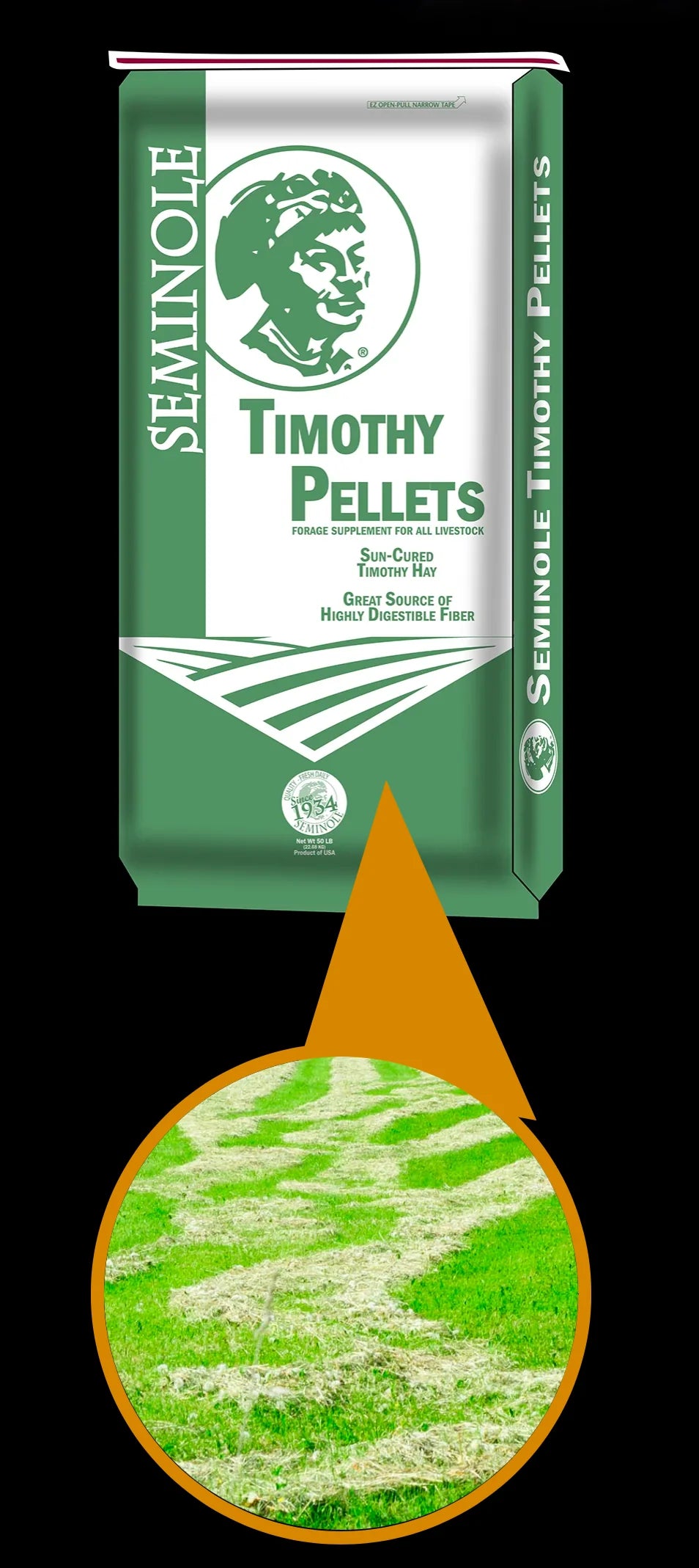 Grass forages and forage products such as timothy pellets provide the fiber your horse needs in a highly digestible form. When used to replace part of the forage in the diet, Seminole Timothy Pellets can provide the necessary roughage without excess calories or protein usually found in alfalfa forages.