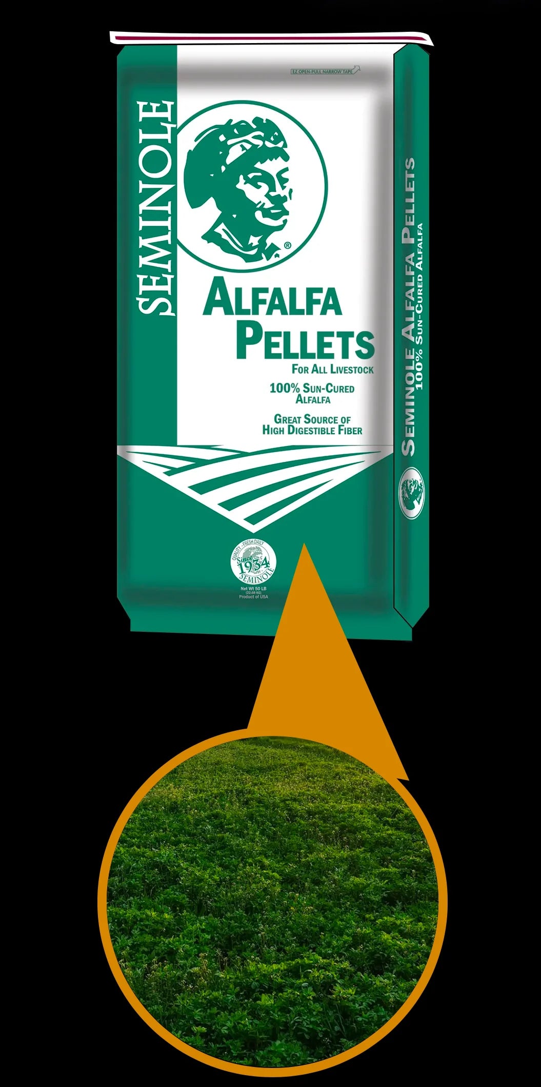 Legume forages and forage products such as alfalfa cubes and pellets provide a denser nutrition profile and are highly digestible. To replace part of the forage in the diet, include Seminole Alfalfa Pellets along with your horse’s daily feed ration to add calories and high digestible fiber.