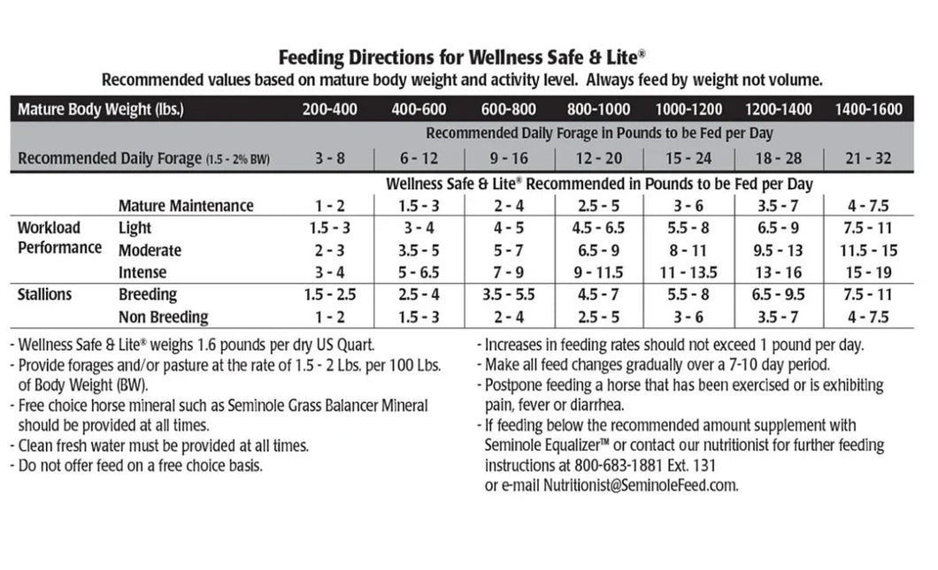Wellness Safe & Lite® is a low-starch, super-premium, low-calorie, pelleted feed for adult horses and ponies requiring lower-calorie diets.  Ideal for the overweight or active pleasure animal, Wellness Safe & Lite® contains high amounts of digestible fiber, which provides cooler calories that reduce hyperactivity.  Whether on the trail or relaxing in the pasture, the superior nutrition of Wellness Safe & Lite® provides support for a healthy lifestyle.