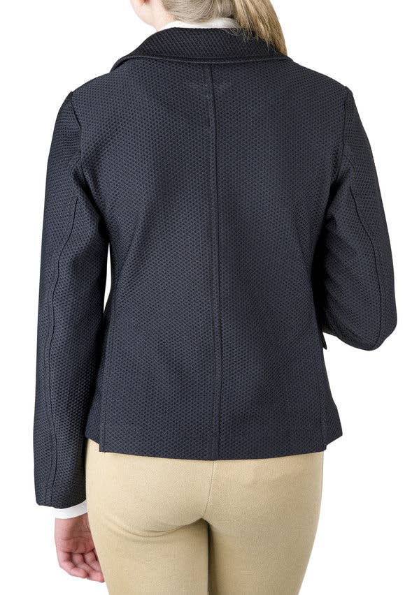 The TuffRider Children's EquiVent Show Coat is the answer to staying calm, cool and collected on show day. Lightweight mesh material allows for total airflow, while ensuring an opaque, traditional look. Waffle-like mesh wicks sweat from the skin to aid in moisture control. A hidden zipper with 4 snap buttons makes for effortless on/off. Princess stitching emulates a traditional, flawless look in the show ring. Achieving that traditional, sleek look doesn't mean sacrificing technical features or comfort!